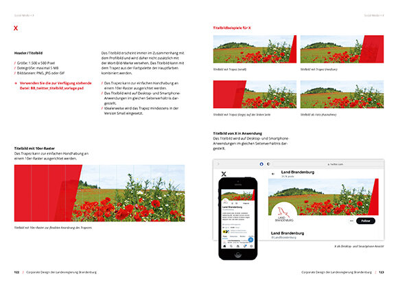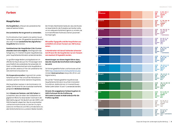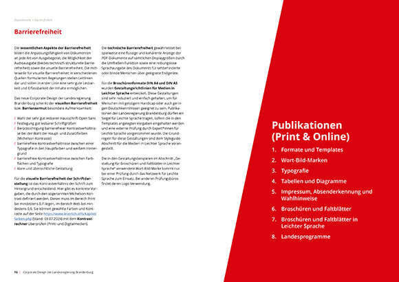 Der Fokus für die Entwicklung des neuen Corporate Designs für das Bundesland Brandenburg lag auf einem prägnanten, unverwechselbaren visuellen Auftritt unter Integration der visuellen Barrierefreiheit. Die neuen Richtlinien umfassen die Bereiche Print- und Onlinemedien, Geschäftsausstattung, Digitalmedien, Event- und Veranstaltungsmedien sowie Social Media. Der neue Styleguide wird flankiert von den Templates für sämtliche Einzelmedien sowie den von uns neu entwickelten Wort-Bild-Marken für die Landesministerien.