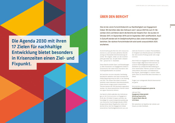 Mit ihren Aktivitäten zur Nachhaltigkeit wendet die Engagement Global gGmbH die Prinzipien des UN Global Compact an macht sie gleichzeitig auch bekannt. Diese Prinzipien bilden die Grundlage für eine integre Unternehmensführung und zukunftsorientiertes Wirtschaften.